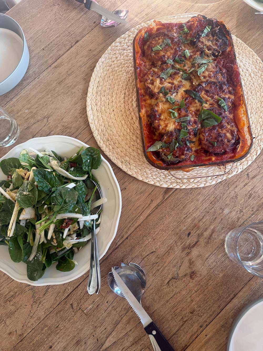 Melanzana alla parmigiana en een spinazie-witlof-truffelsalade.