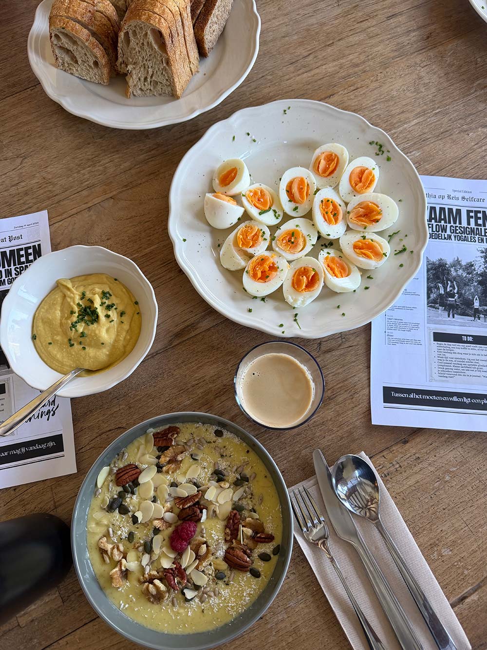 Smoothiebowl met brood met een gekookt eitje en mango hummus.