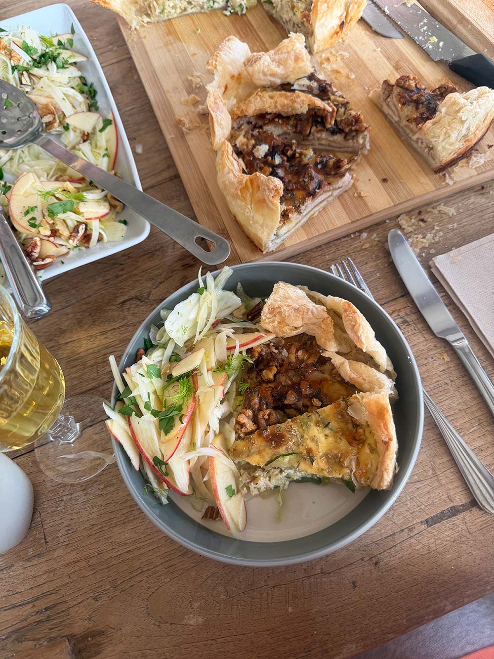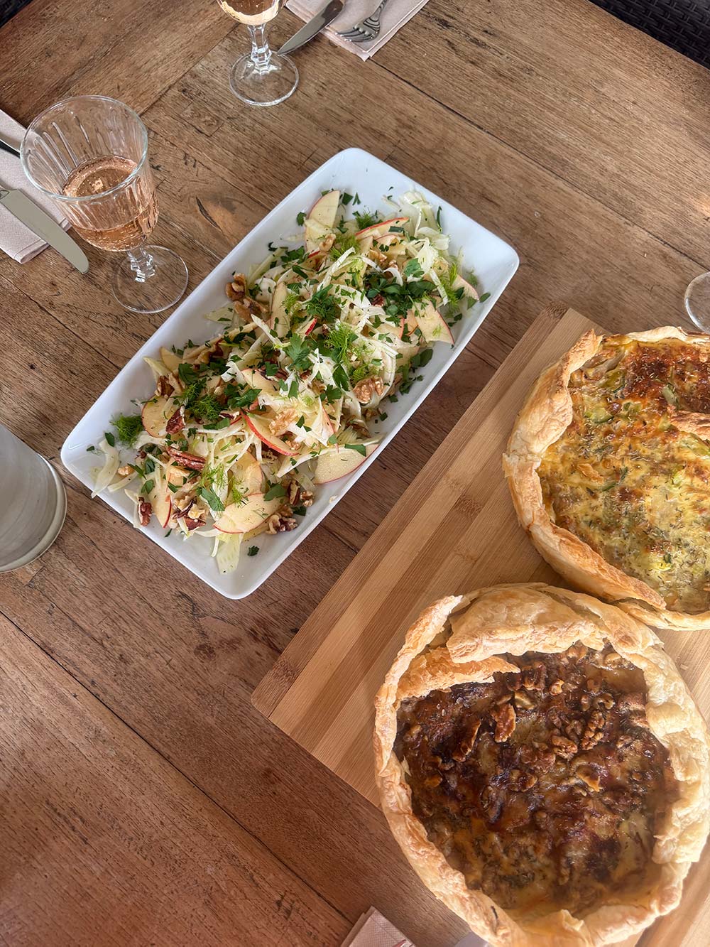 Twee verschillende quiches met een witlof-appelsalade.