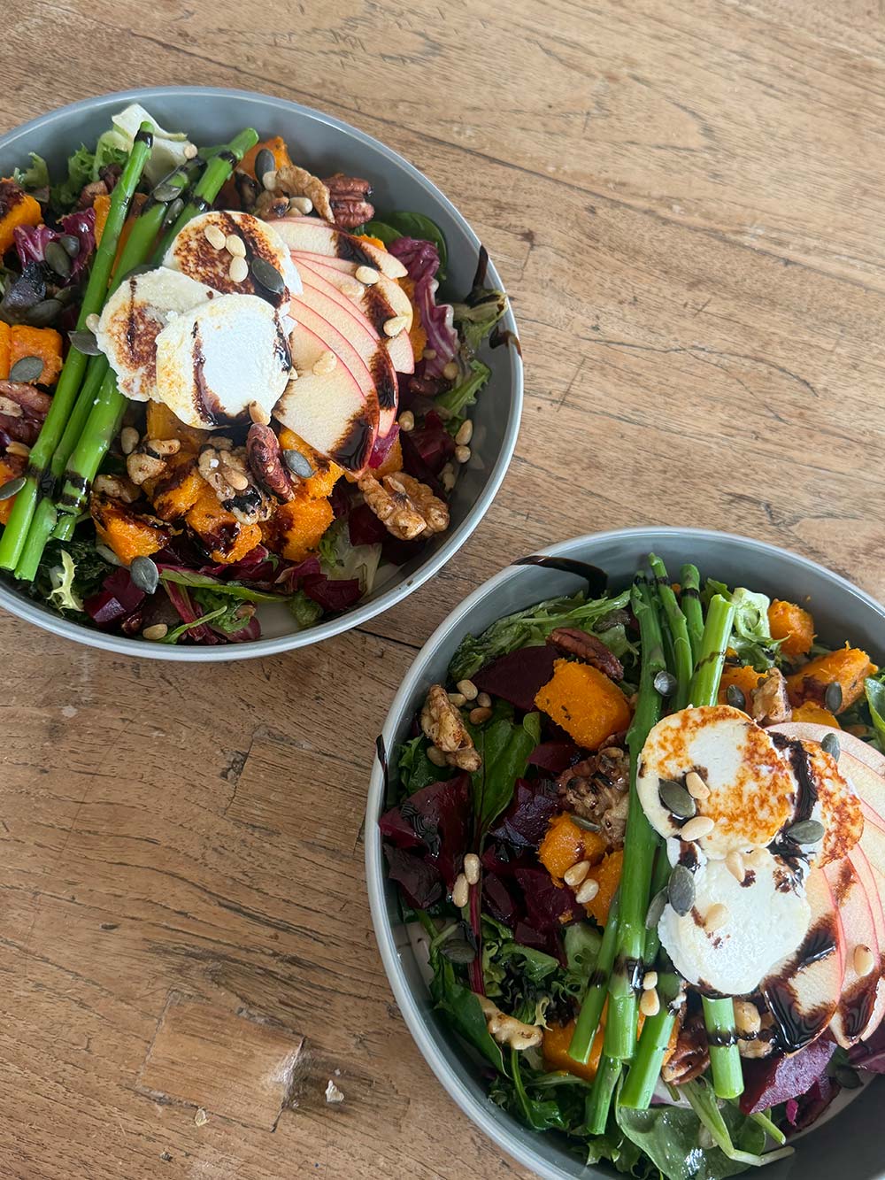 Salade met geitenkaas, biet, pompoen, asperge en noten.