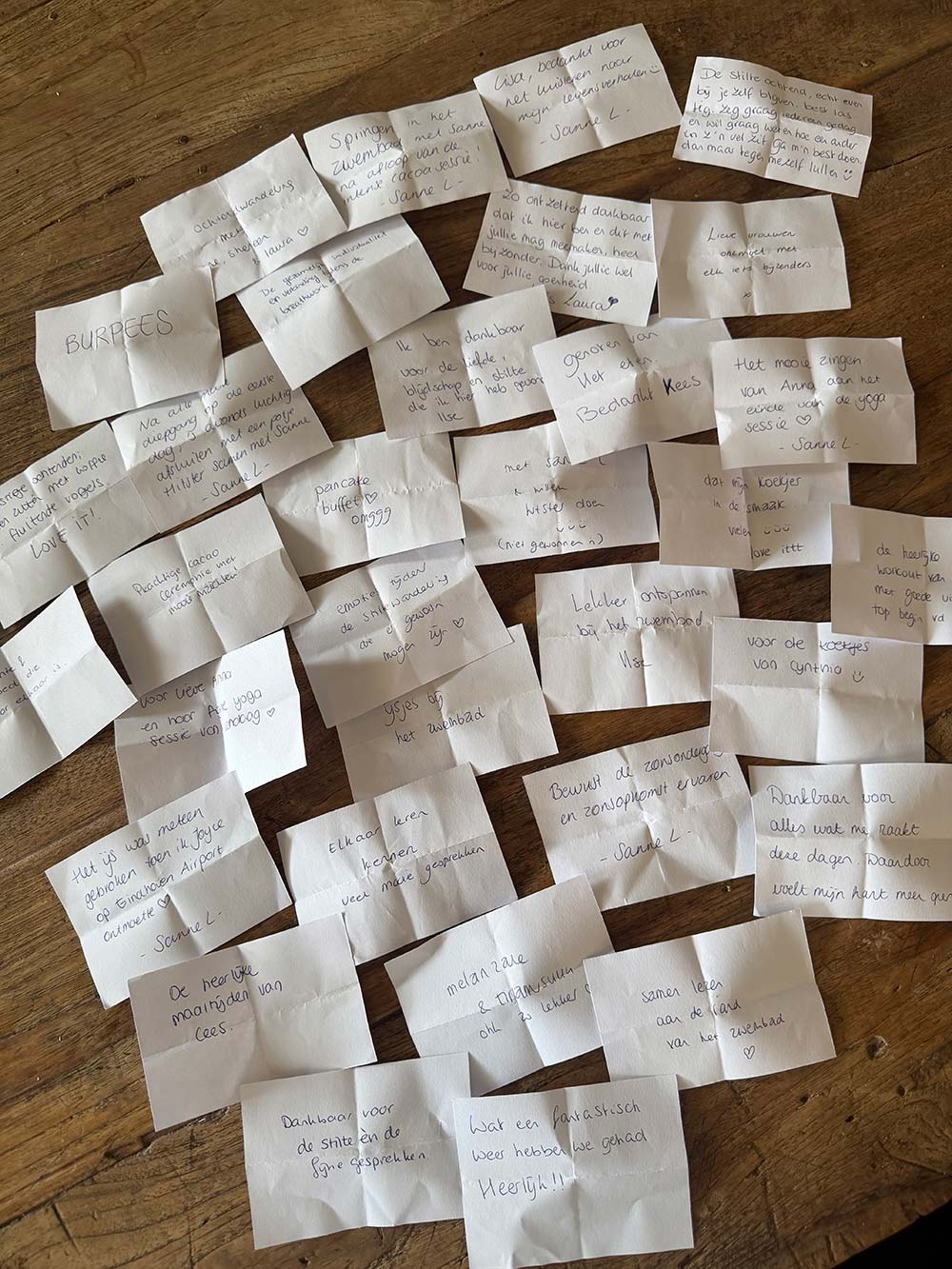 Tijdens de retreat is er altijd een ‘Mooie momenten kom’ waar iedereen de hele week briefjes indoet met mooie, fijne momenten, of dingen waar ze dankbaar voor zijn. Op de laatste avond halen we die kom samen leeg en lezen we alles door, om zo de hele retreat nog even te herbeleven. Ik bewaar de briefjes altijd.