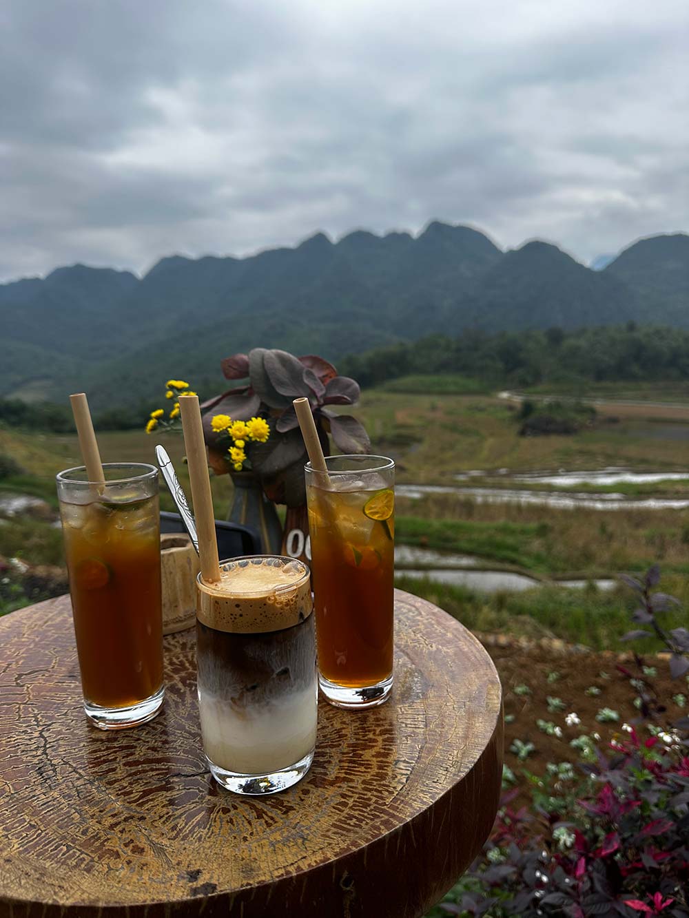 We dronken koffie in een klein lokaal cafeetje met uitzicht op de vallei. Waar we, hoe kan het ook anders in Vietnam, waanzinnig lekkere koffie dronken. Wat ons opviel was dat iedereen bezig was: werken op het veld, koken of repareren.