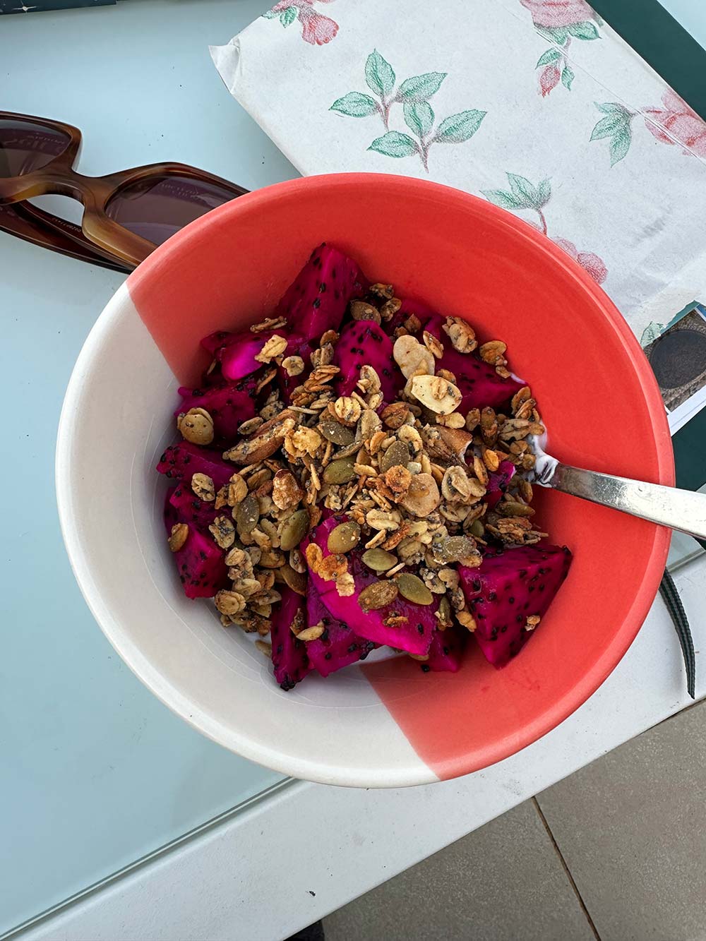 Ontbijtje op ons balkon. Ik vind dragon fruit altijd zoooo mooi.