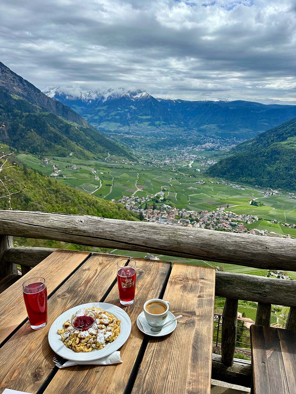 Onze eerste stop: Vitalpina Hotel Schulerhof in Plaus, vlak bij Naturns. Dit deel van Zuid-Tirol ligt in het westen van de regio, op zo’n half uurtje van Merano — en hier begon onze reis tussen de appelbomen, wandelpaden en zonnige terrassen. Zuid-Tirol (of Alto Adige, zoals het ook genoemd wordt) ligt in het noorden van Italië, maar voelt als een mix van Oostenrijkse bergdorpjes en Italiaanse flair. Je zegt hier net zo makkelijk Gutenmorgen als Buongiorno, eet Kaiserschmarren én risotto, en wisselt een hike af met een espresso in de zon. Het is precies die mix die Zuid-Tirol zo bijzonder maakt.