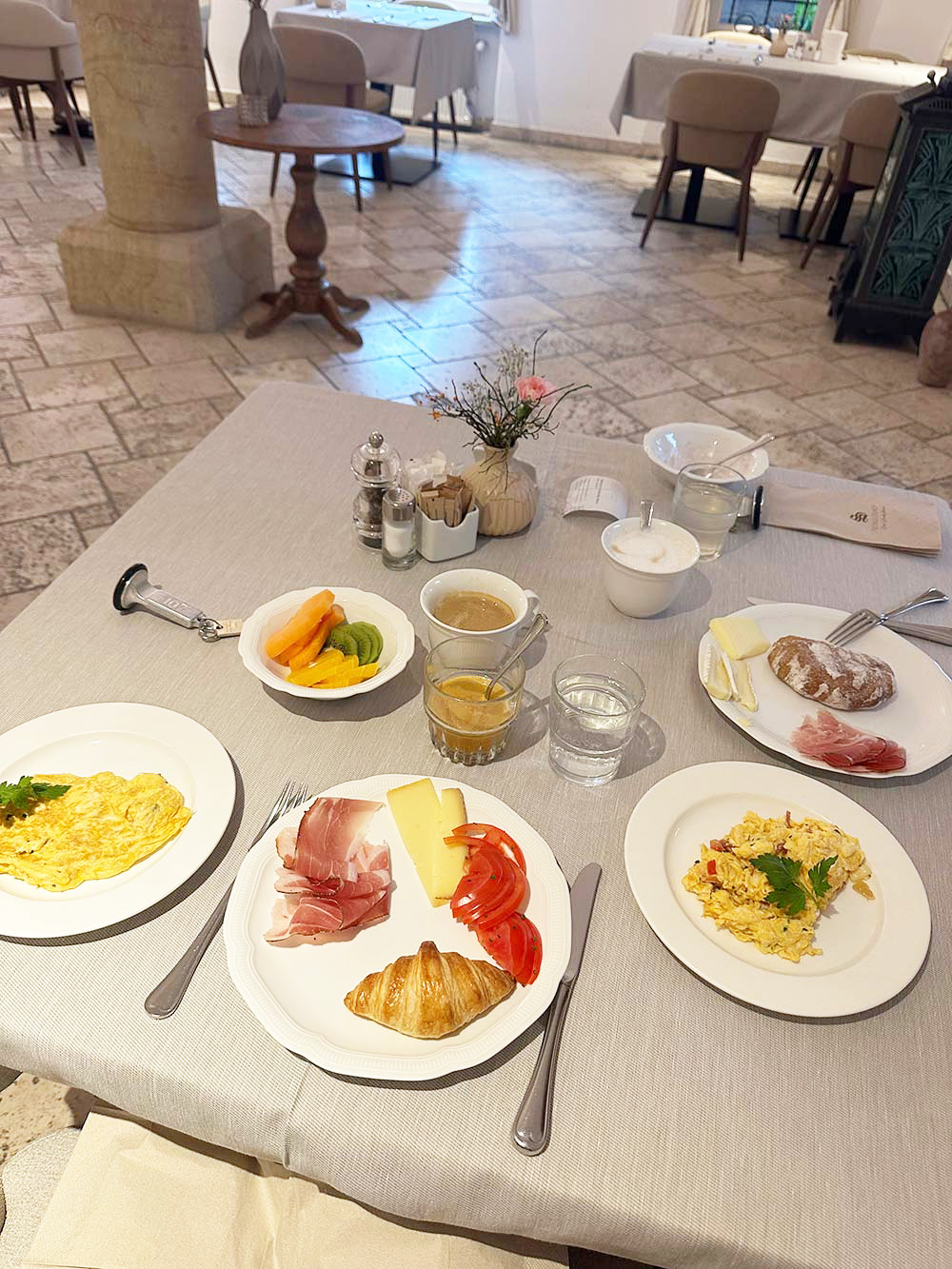 Wat opvalt, is hoe lokaal en seizoensgebonden er gekookt wordt. Ingrediënten komen vaak uit de regio, van boerderijen en producenten in de buurt, en dat proef je echt. Van knapperig brood en huisgemaakte jam bij het ontbijt tot verse pasta’s, salades en verfijnde desserts in de avond — alles is smaakvol, vers en met aandacht bereid. Ik laat je hieronder wat van onze culinaire uitspattingen zien, want geloof me: dit wil je. 😍