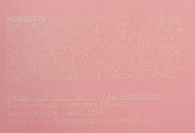 Dit zijn de bestanddelen. SLES voor het lekkere volle schuim en parfum staat vrij ver bovenaan. De formule is iets anders dan de andere shower foams van Rituals, hierin zit bijvoorbeeld ook melk verwerkt. Na het gebruik van een shower foam gebruik ik altijd nog iets wat mijn huid lekker zacht maakt, zoals de body cream of de body scrub, want dit laat mijn huid wel altijd een tikkeltje droog achter.
