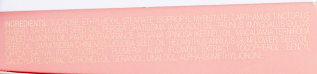 Dit zijn de bestanddelen van de Body Scrub. Het hoofdbestanddeel is suiker, en verder zit er een boel saffloer olie in, avocado olie, amandelolie, arganolie, macadamia olie, jojoba olie en zonnebloemolie. Deze oliën zijn super verzorgend voor je huid! Ook zit er vitamine E in, rijstextract en frangipani extract.