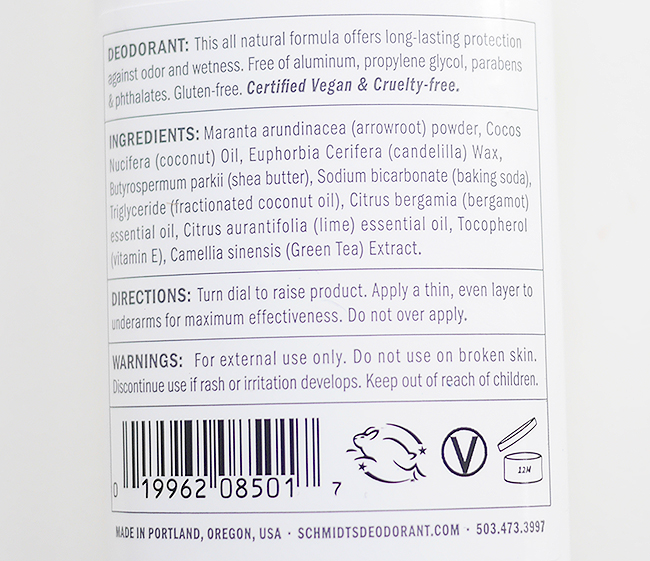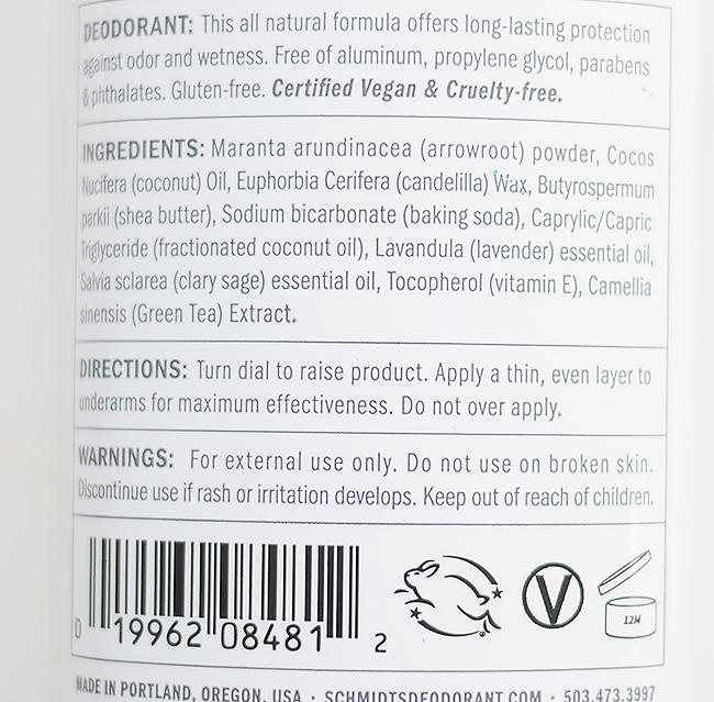 Informatie achterop de verpakking en de bestanddelen. Volgens Schmidt’s biedt deze natuurlijke formule een langdurige bescherming tegen nattigheid (haha!) en geurtjes. Vrij van aluminium, propylene glycol, parabenen en ftalaten. Deze deo is geschikt voor veganisten en is ook vrij van dierproeven.