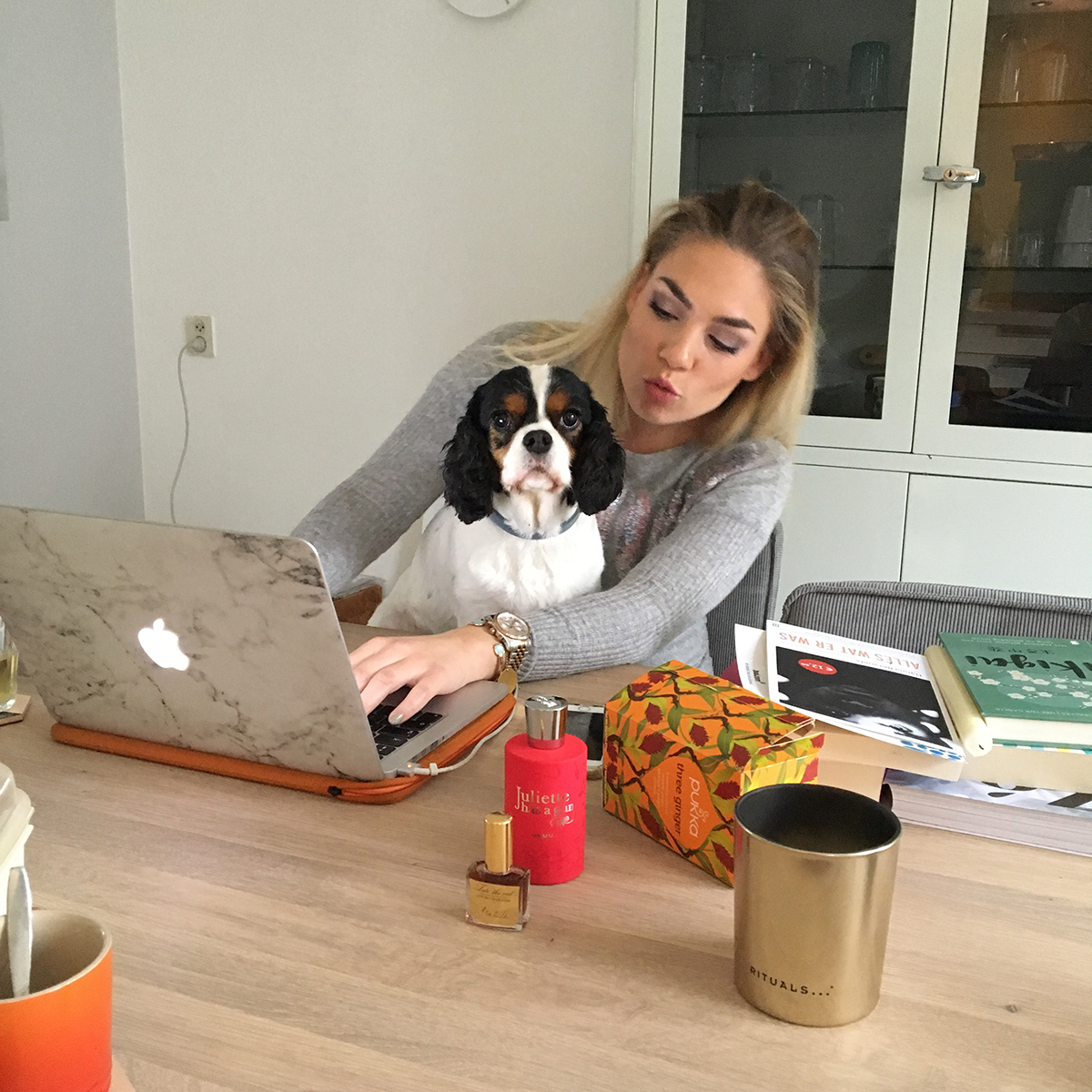 En we gaan voor een houtkachel kijken! Jaaaa, eindelijk. Ik droom daar al zo lang van. En daar staat dit enorm schattige cavaliertje waar ik heel lang mee sta te knuffelen.