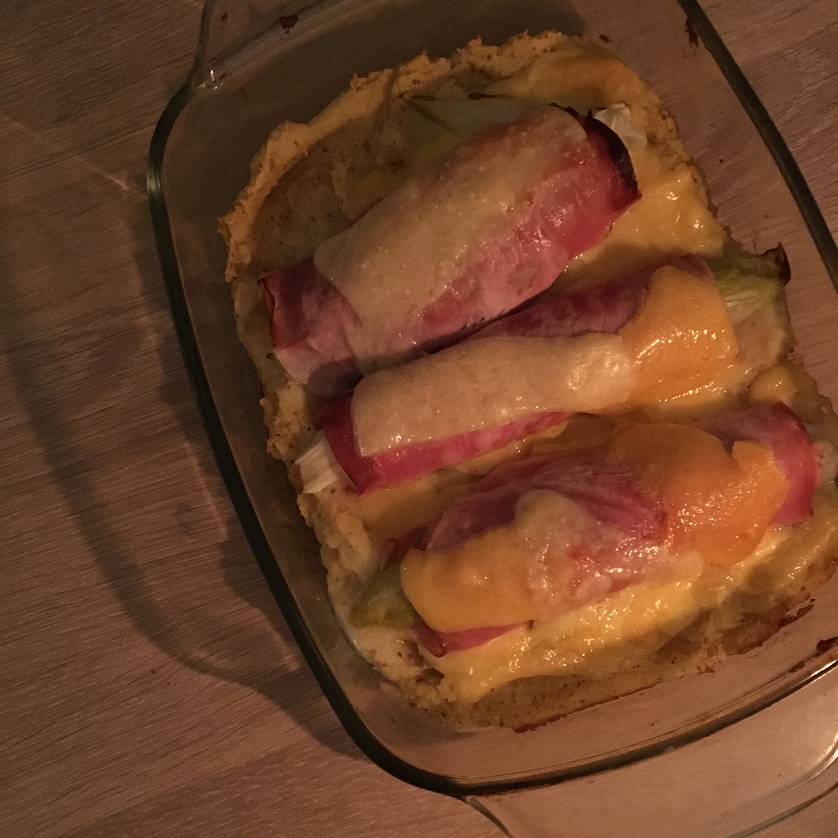 ’s Avonds eten we witlof uit het groente-abonnement met ham en kaas en dat is heerlijk. Eronder zit aardappelpuree met mosterd.