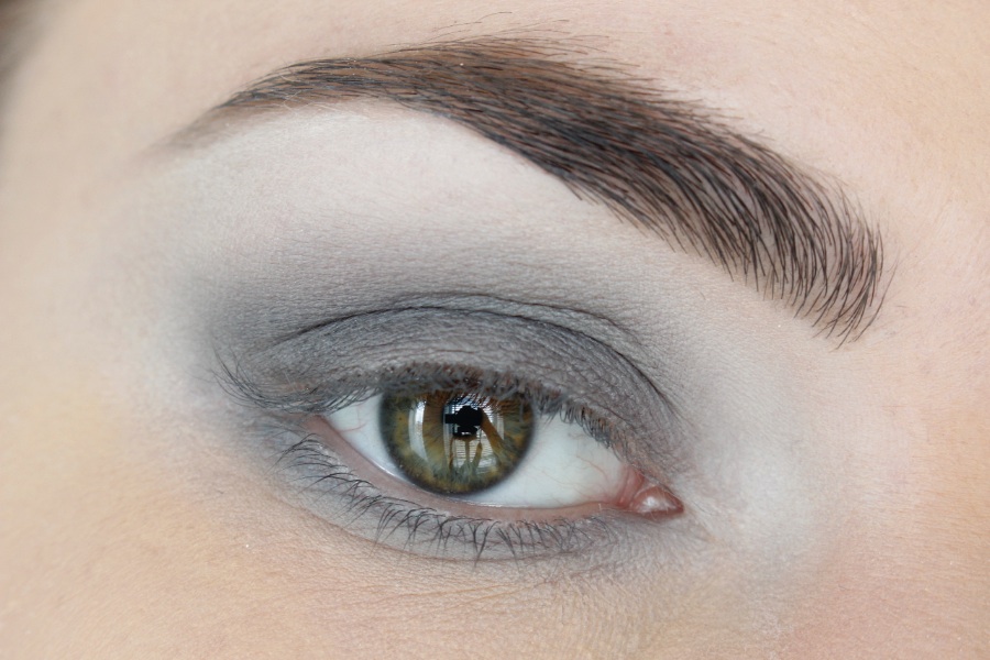 Daarna breng ik met een platte, maar toch fluffy kwast de grijze oogschaduw aan op mijn bewegend ooglid en ook eronder. Ik pak het tegen de wimperrand dik op, en laat met de restjes die op de kwast zitten dit een beetje naar boven toe uitlopen.