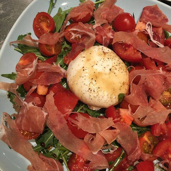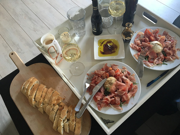 Als ik één ding mag kiezen wat ik zelf thuis maak wat ik het állerlekkerst vind is dat burrata. Oké, de burrata maak ik niet zelf, maar ik maak er wel zelf een gerecht van. Met veel cherry- en trostomaten, rucola, parmaham, goede balsamico-azijn en goede olijfolie. En dan daarbij ciabatta om in de olijfolie en balsamico te dippen, wit wijntje erbij… Wat een feest. Dit is echt mijn favoriete gerecht en het staat zó op tafel. Burrata is echt… ik heb er geen woorden voor.