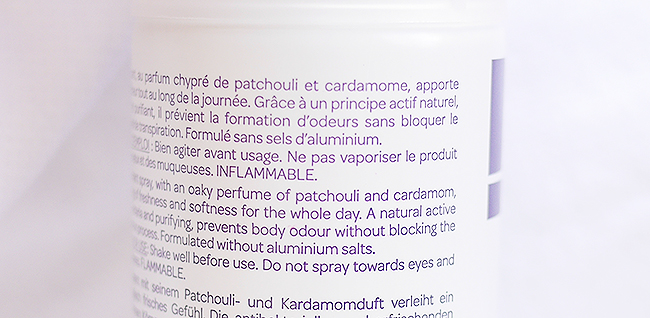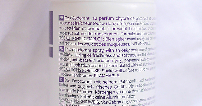 De houtachtige geur met ondertonen van patchouli en kardemom omhullen de huid met een subtiele geur.[ 0% DRIJFGAS – 0% ALUMINIUM ZOUTEN]