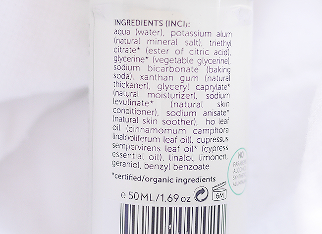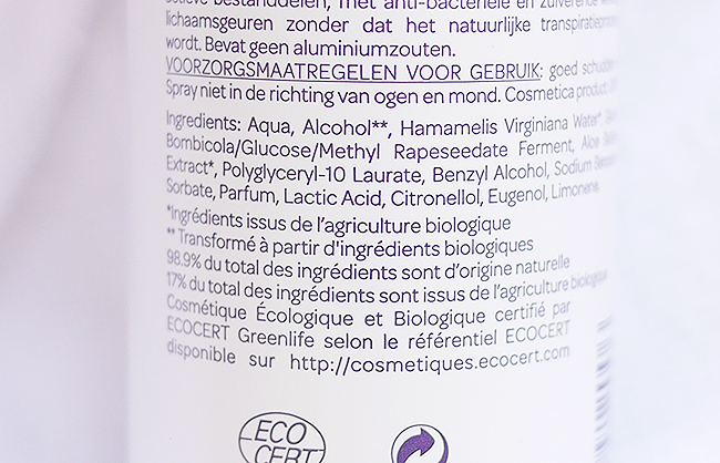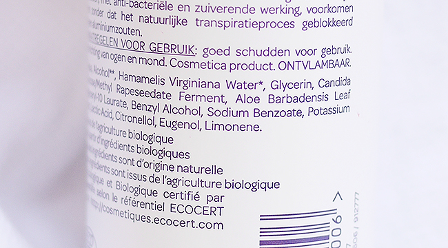 Dat is duidelijk. Ik dacht wel meteen: oei, alcohol… Droogt uit en irriteert maar werkt natuurlijk ook ontsmettend. Ik merk er zelf alleen wat van als ik net mijn oksels geschoren heb, dan prikt het héél iets, maar niet zo erg dat het echt vervelend is. Er zit geen parfum in en geen aluminiumzout. De ingrediënten zijn 98.9% natuurlijk.